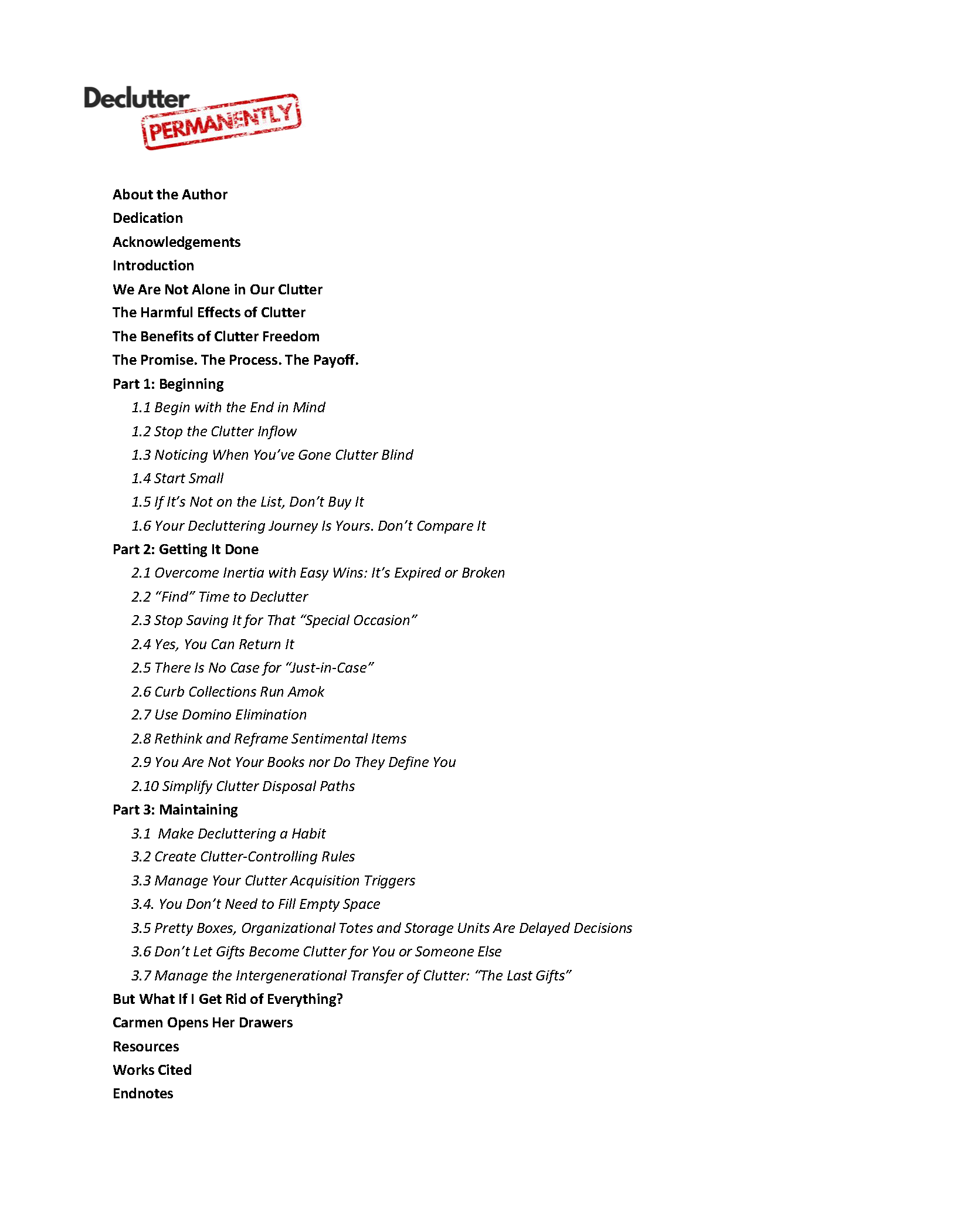 Investing in a book means that the reader must find value. Does it the content align with your interests and needs, and does it have the depth and breadth of the information you are looking for? Declutter Permanently is purposefully constructed to support you in your decluttering journey from beginning to maintaining with a structured approach. Take a peek.